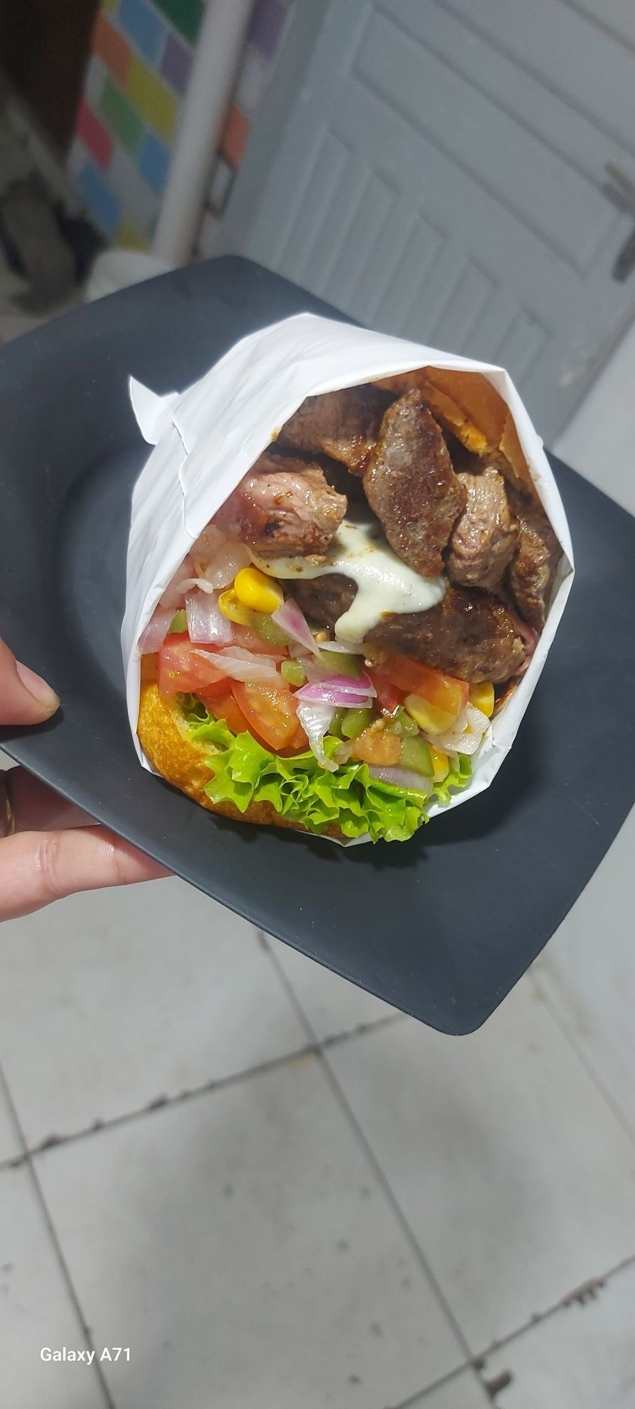 Pão, Hamburguer, Alcatra, Mussarela, Alface, Tomate, Milho, Pepino, Vinagrete