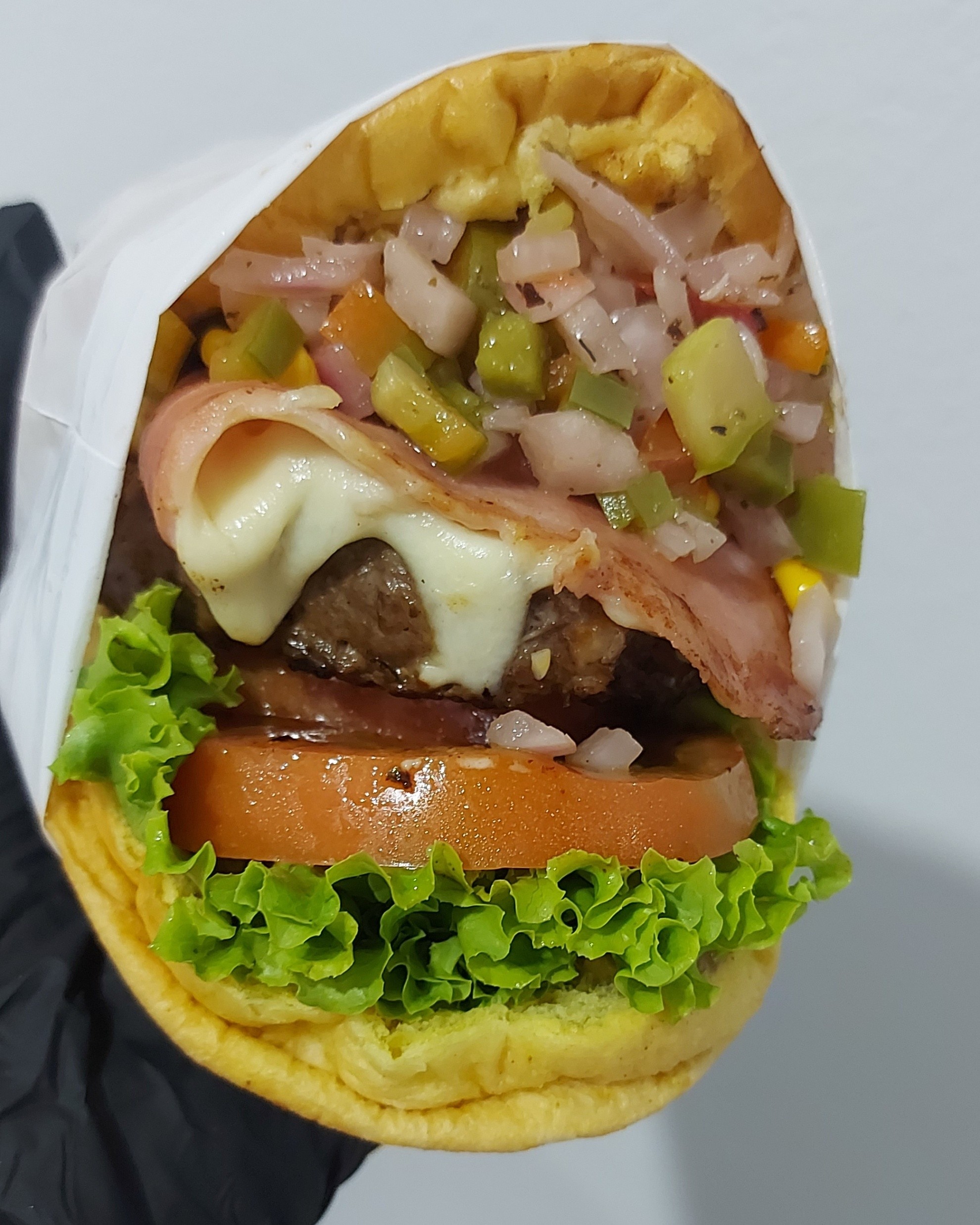Pão, Hamburguer, Queijo Mussarela, Presunto, Alface, Tomate, Milho, Pepino, Vinagrete