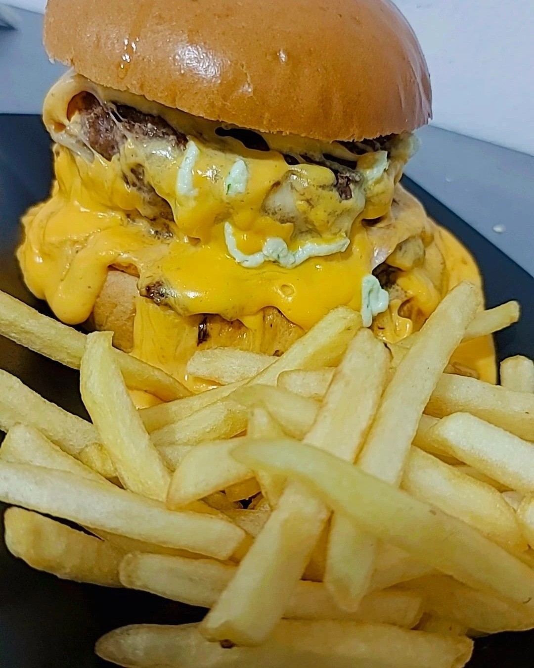 Pão, 02 Hamburguer, 150g cada, Creme de Cheddar, Maionese Caseira, Fritas