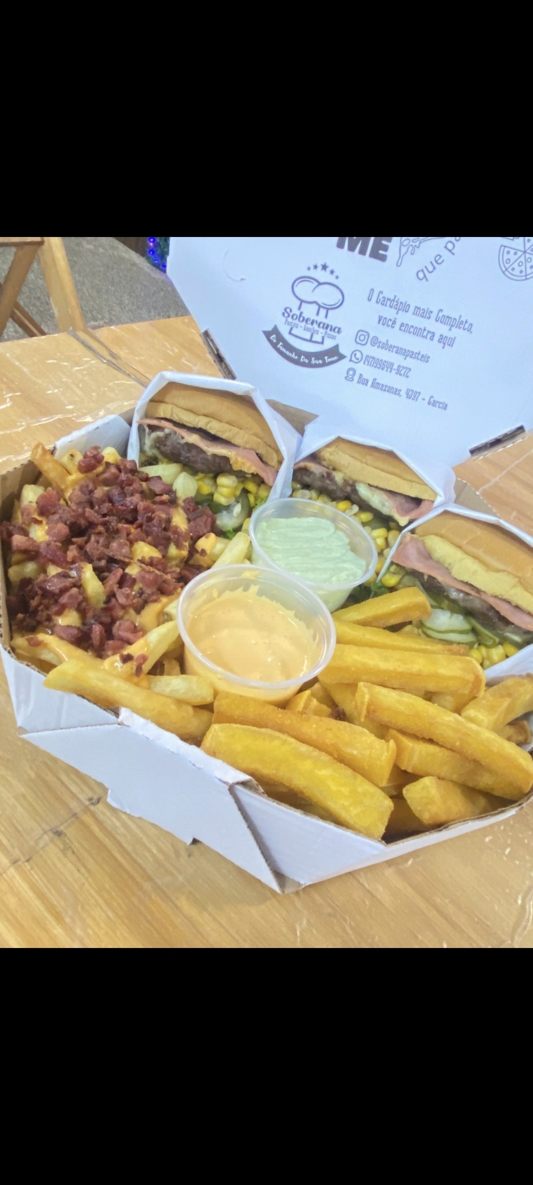 3 Burguer Salada, Fritas com Cheddar e Bacon, Acompanhamento de Sua Preferencia, Potinho de Cheddar, Potinho de Maionese Caseira